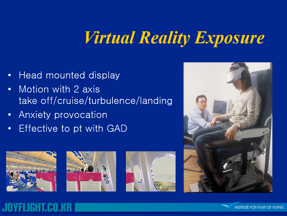 본 연구소는 기내모형(mock-up)에서의 AV 프로그램, 가상현실프로그램, 치료적 비행 등 점진적으로 구성된 노출 프로그램을 제공합니다.